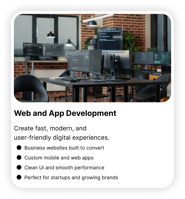 We create websites, apps, and online systems that are fast, easy to use, and built around your business goals. Our focus is on helping you get more customers, build trust, and grow online without making things complicated.